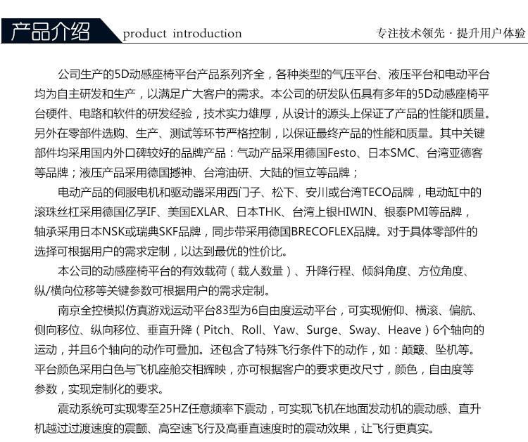 公司生產(chǎn)的 5D 動感座椅平臺產(chǎn)品系列齊全,各種類型的氣壓平臺、液壓平臺和電動平臺均為自主研發(fā)和生產(chǎn),以滿足廣大客戶的需求。本公司的研發(fā)隊伍具有多年的5D 動感座椅平臺硬件、電路和軟件的研發(fā)經(jīng)驗,技術(shù)實力雄厚,從設(shè)計的源頭上保證了產(chǎn)品的性能和質(zhì)量。另外在零部件選購、生產(chǎn)、測試等環(huán)節(jié)嚴(yán)格控制,以保證最終產(chǎn)品的性能和質(zhì)量。其中關(guān)鍵部件均采用國內(nèi)外口碑較好的品牌產(chǎn)品: