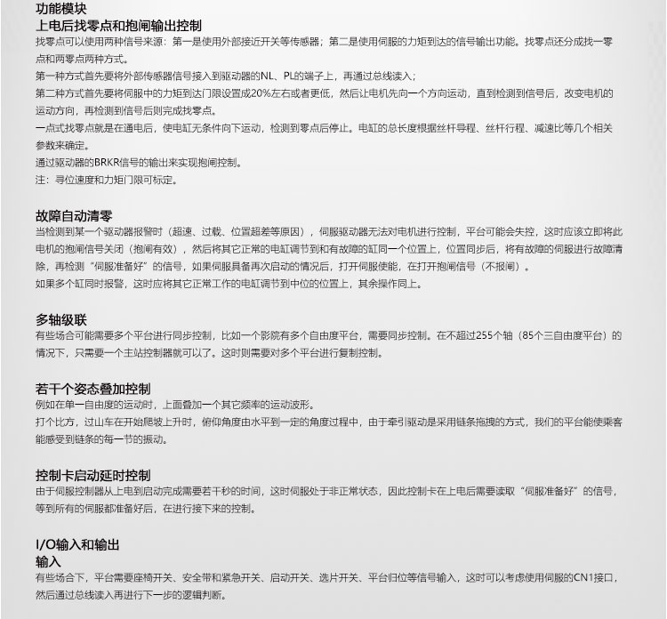 答: 我公司主要從事仿真平臺(tái)、六自由度平臺(tái)和運(yùn)動(dòng)平臺(tái)控制卡的研發(fā)、生產(chǎn)與銷售,同時(shí)承接大型4D/5D/7D影院等工程。專注技術(shù)領(lǐng)先,提升用戶體驗(yàn)是我們的追求!