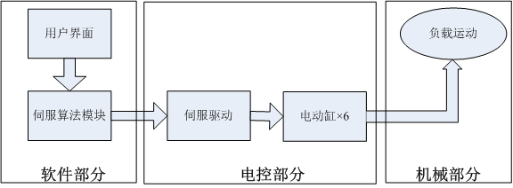 六自由度運動平臺系統由測試軟件部分系統、電氣控制系統、動力電源系統、運動平臺機械本體組成。運動平臺部分的組成結構示意圖如圖3.1所示。