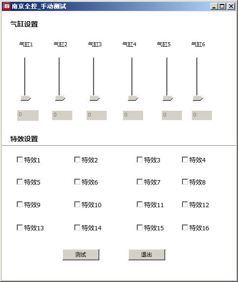 測試電缸/油缸:在測試界面上,將“氣缸設置”下方的“缸1”中的滾動條向上拖動,這時平臺的1號位置的電缸/油缸會上升到相應的位置;向下拖動時,1號缸會下降到相應的位置。依次按此操作測試缸2、缸3、缸4、缸5、缸6。如果都能正常上升和下降,則平臺工作正常。